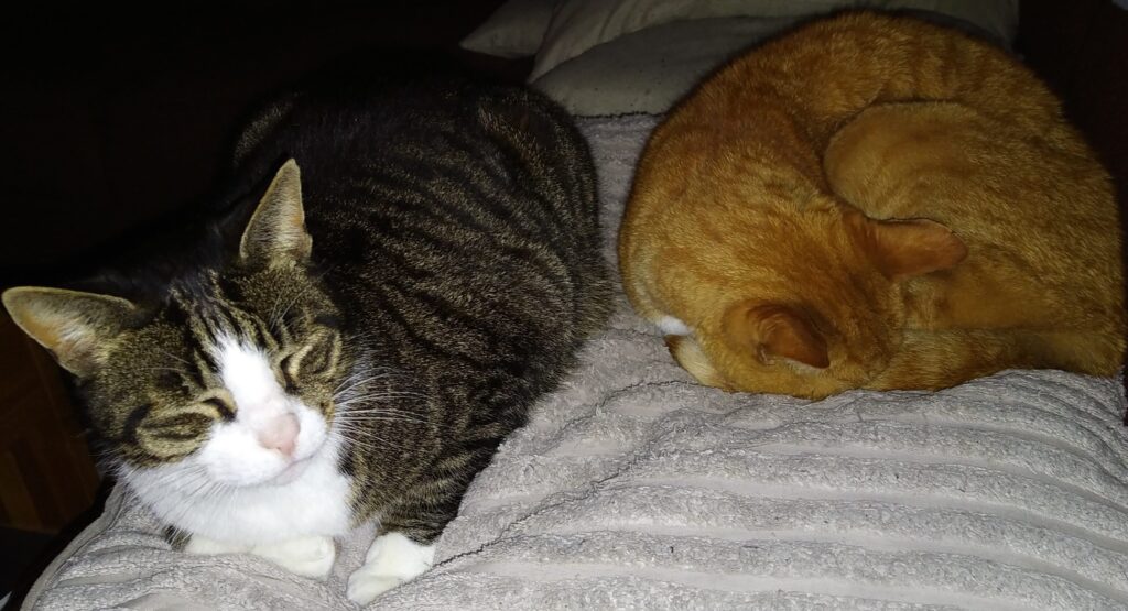 Samen met onze twee oude katten, Bill en Ted, wonen we in Hoorn. Zo dicht bij het Markermeer dat we daar geregeld een rondje langs wandelen. Terwijl de twee oude mannetjes op hun kussentje liggen.